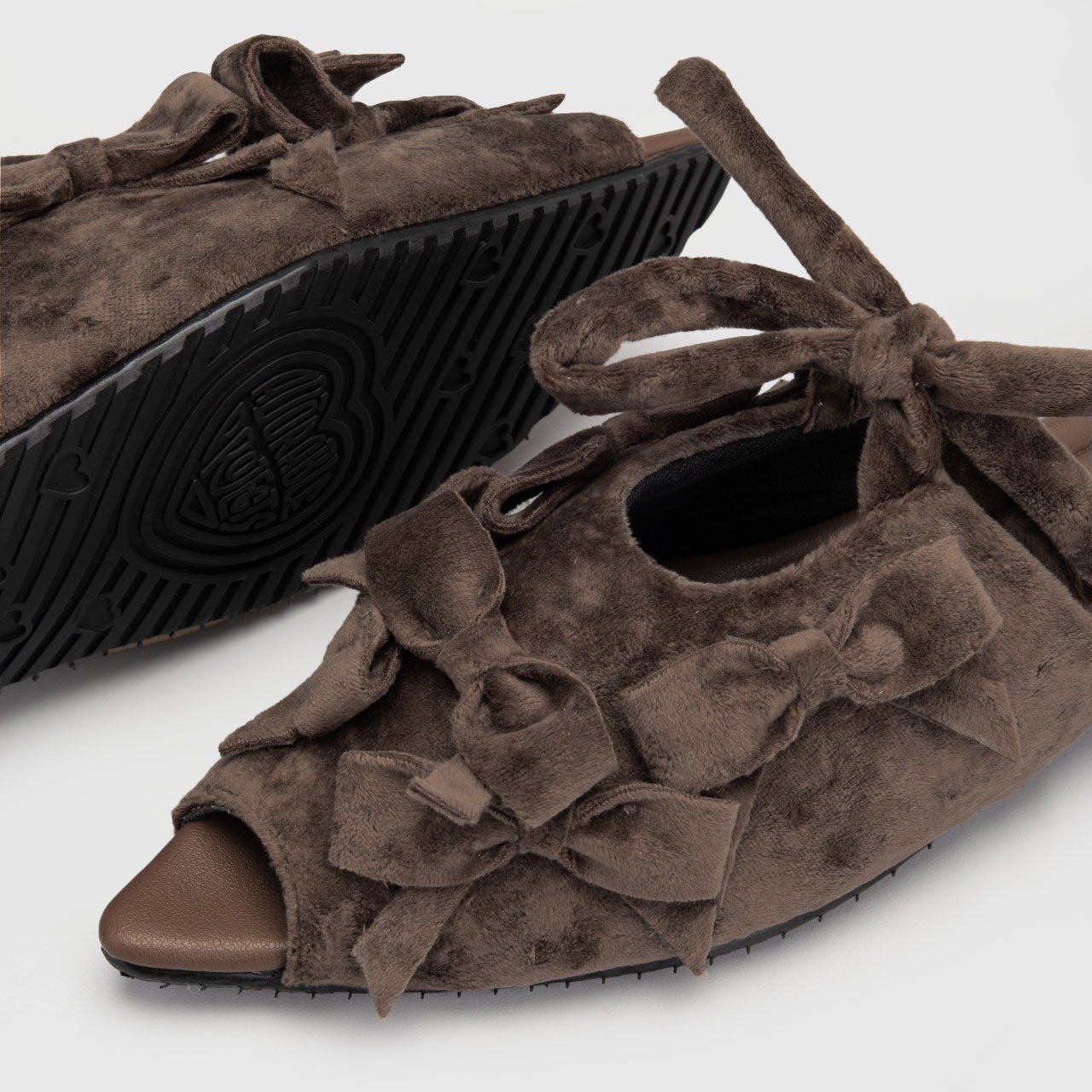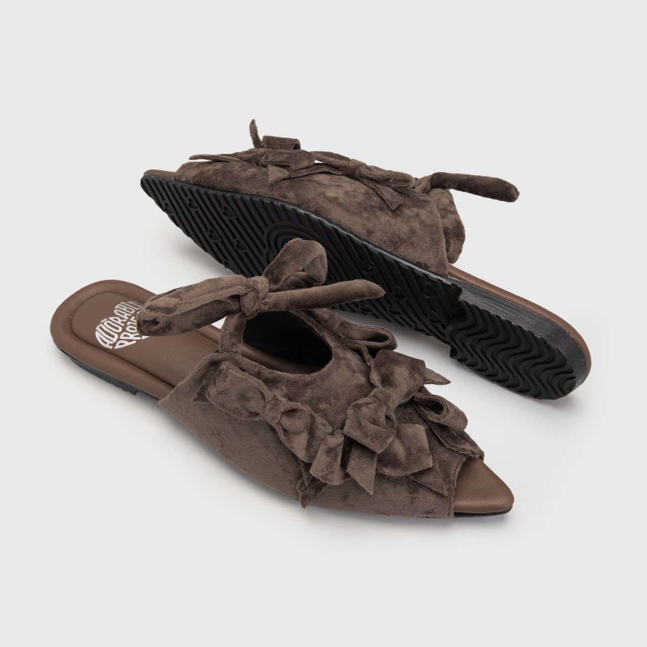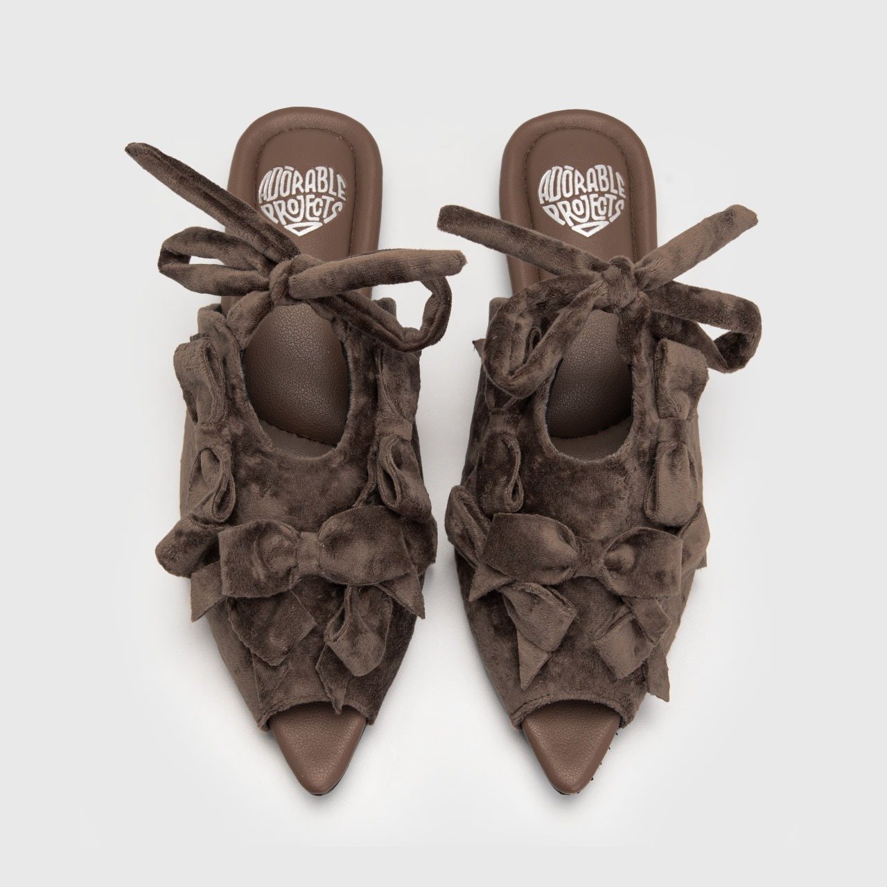 Delicate ribbon accents bloom across the upper, tied with intention and artistry. Each bow adds a romantic dimension soft, graceful, and expressive. Balancing the minimalist mule shape with a sense of charm and individuality.