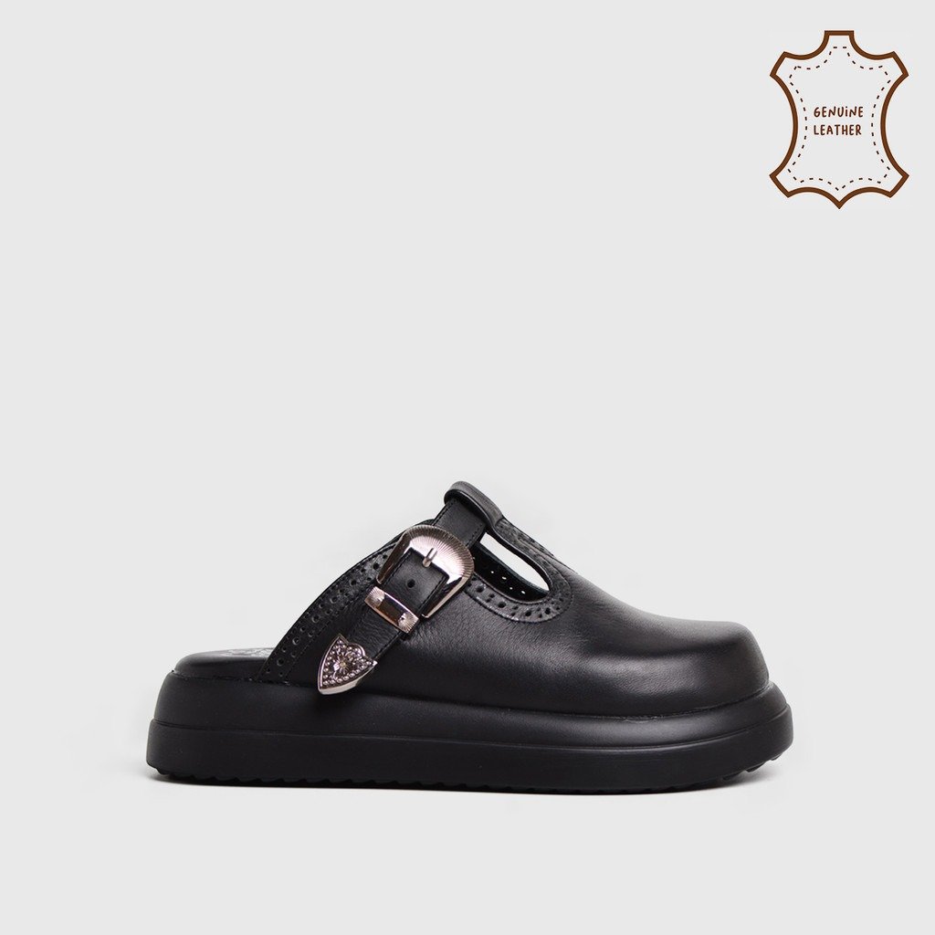 Aitra is a stylish pair of mules sandals featuring a low-height platform, crafted with a lightweight polyurethane outsole and a Genuine leather upper. These mules are adorned with metal embellishments, offering a modern and chic look.