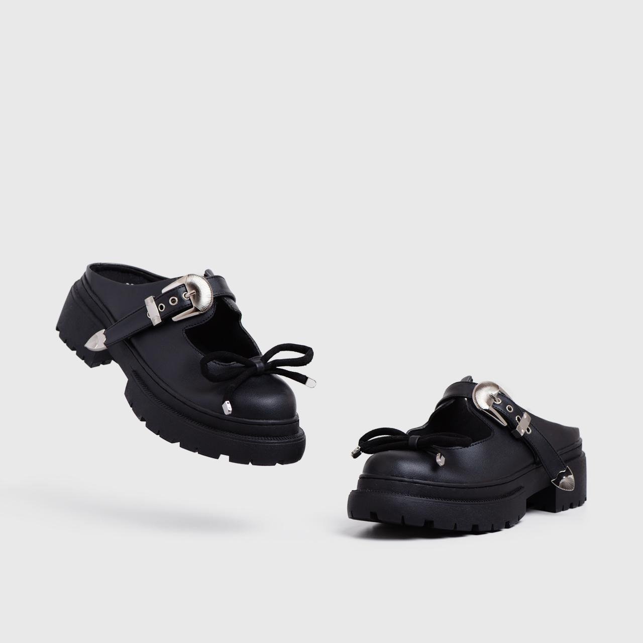 Axana is a stylish and versatile pair of chunky round toe mules that combine comfort with fashion. With their unique design, metal buckle, and ribbon embellishments, Axana offers a chic and trendy footwear option for those who want to make a statement with their shoes.