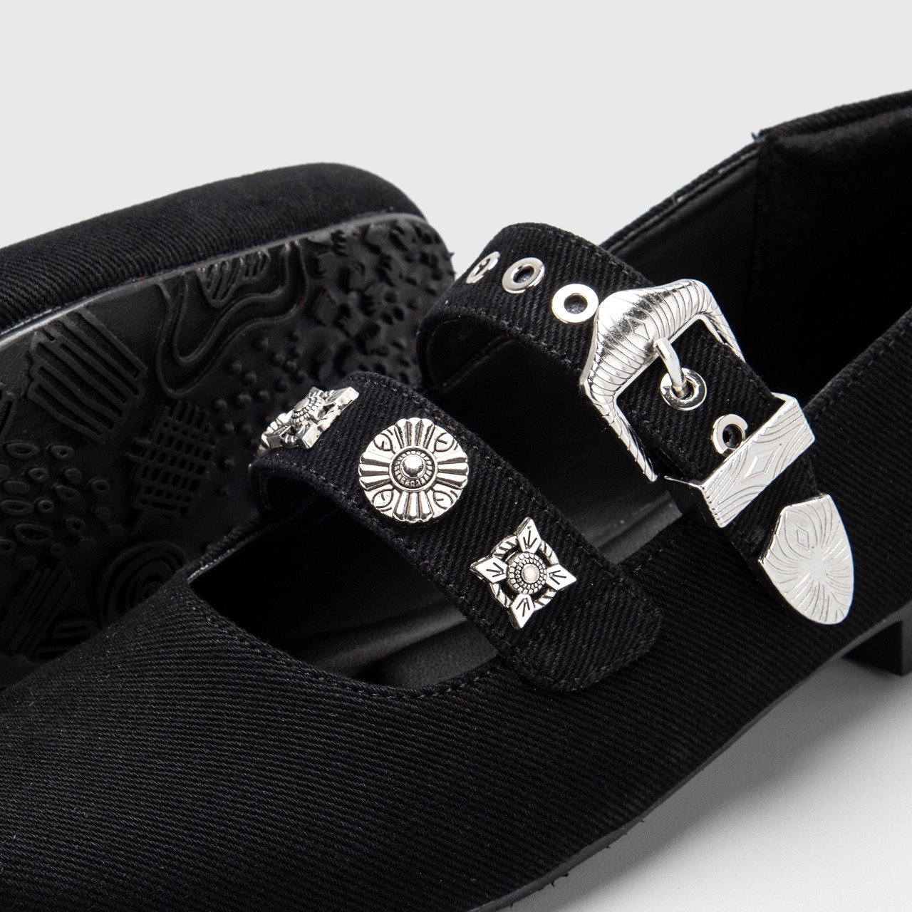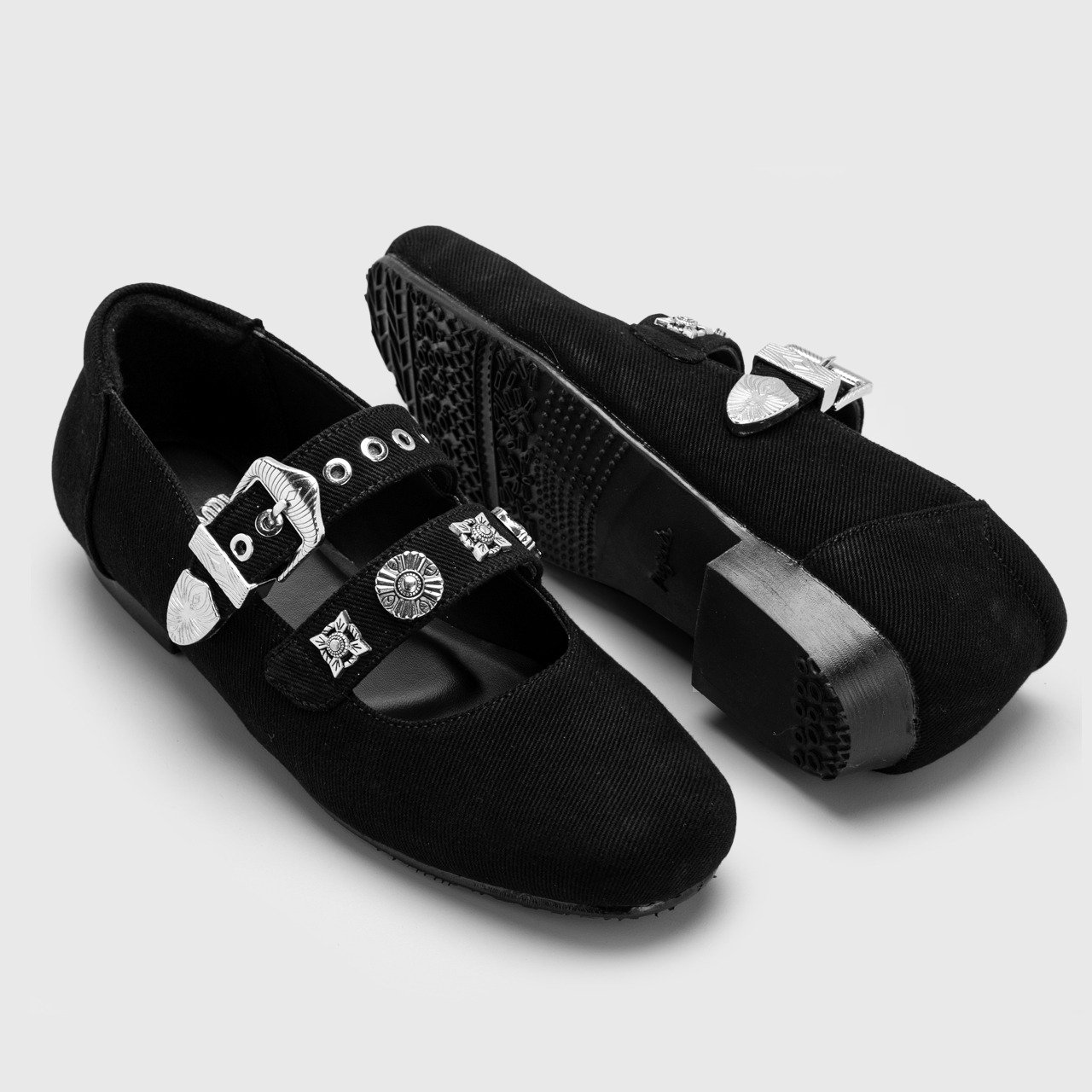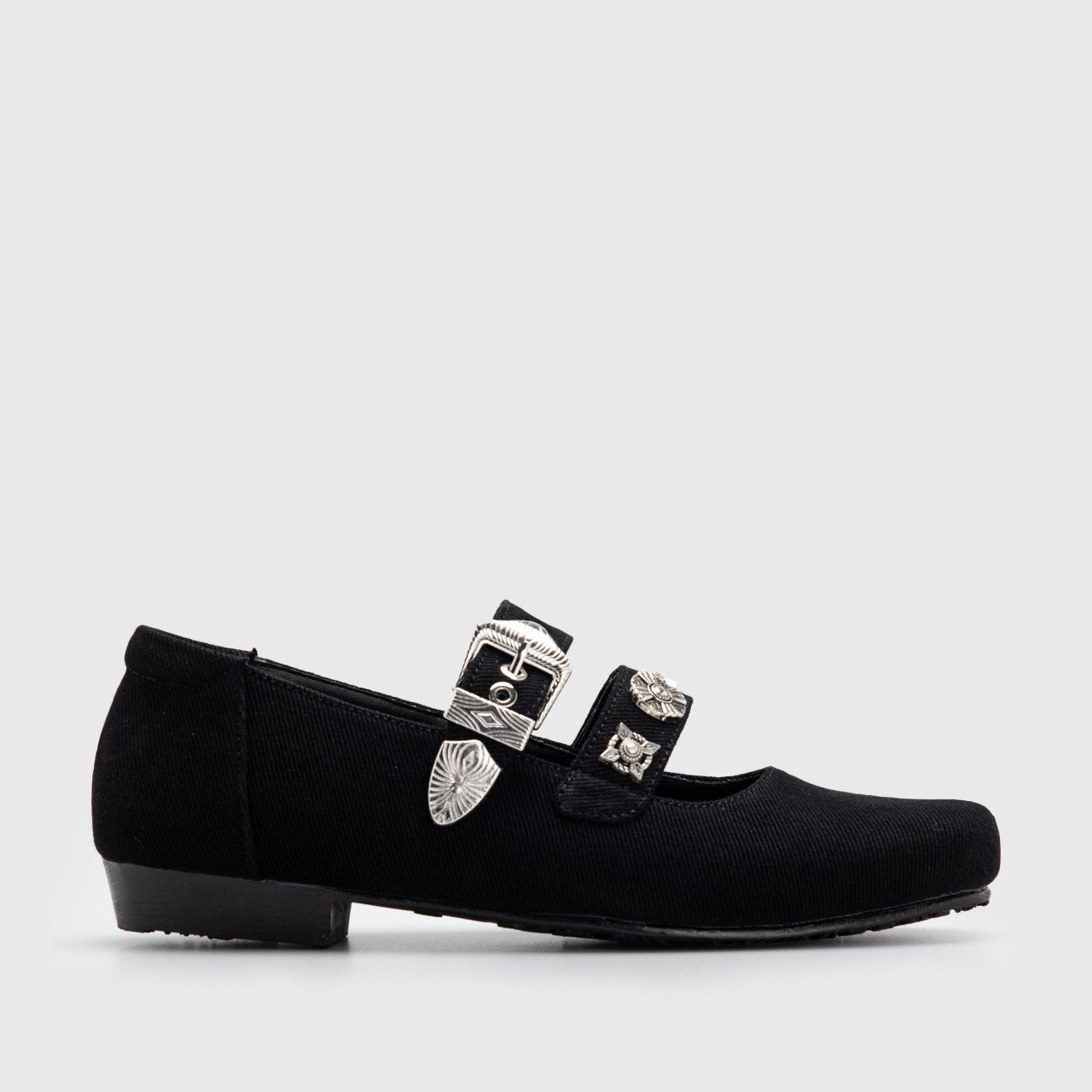 BRIGITT is a pair of square toe flat shoes that seamlessly blend trendy style with comfort. These flat shoes are crafted from denim fabric, adding a touch of casual charm to their design. The double strap and metal engraved embellishment enhance their visual appeal, creating a unique and eye-catching silhouette.