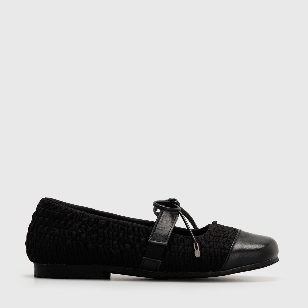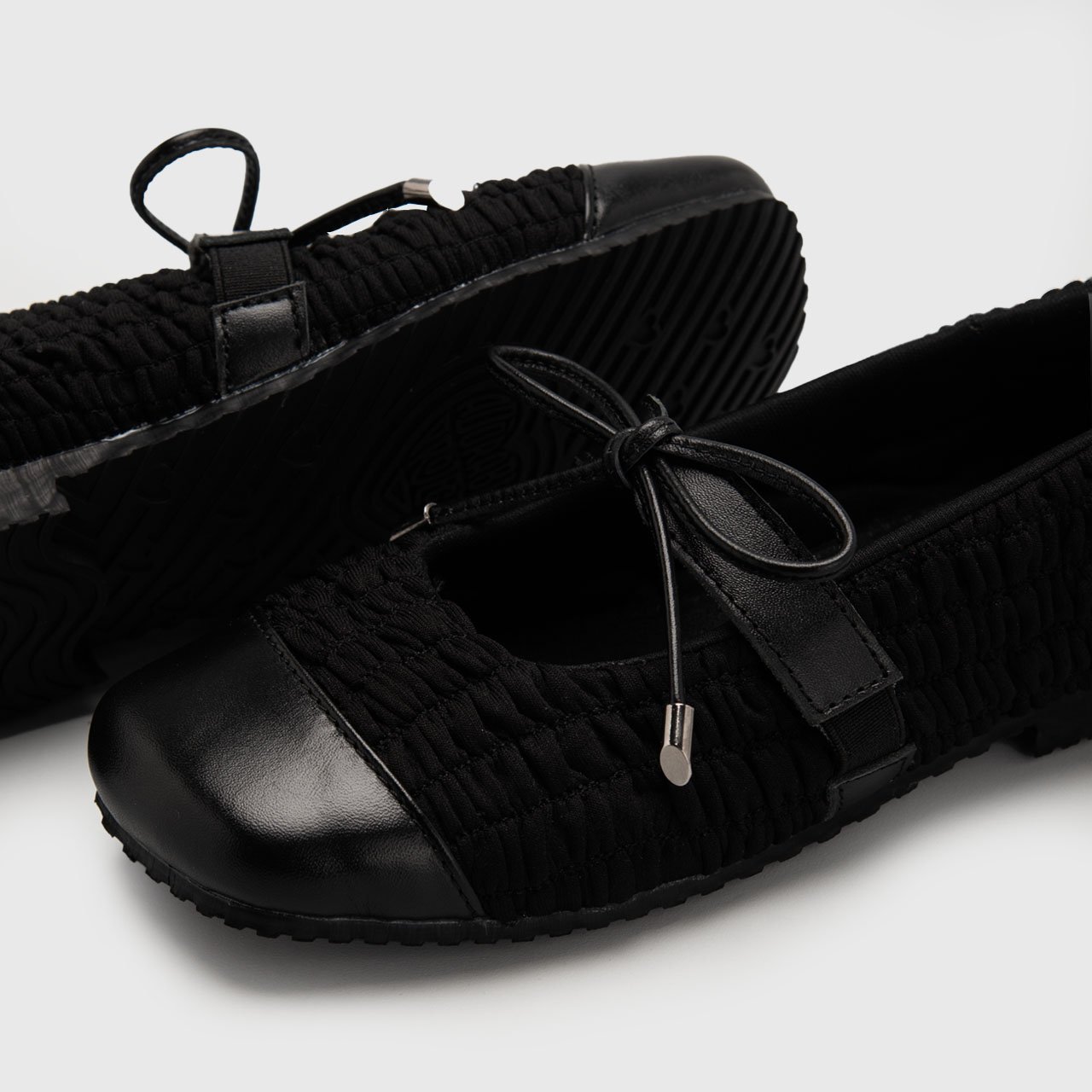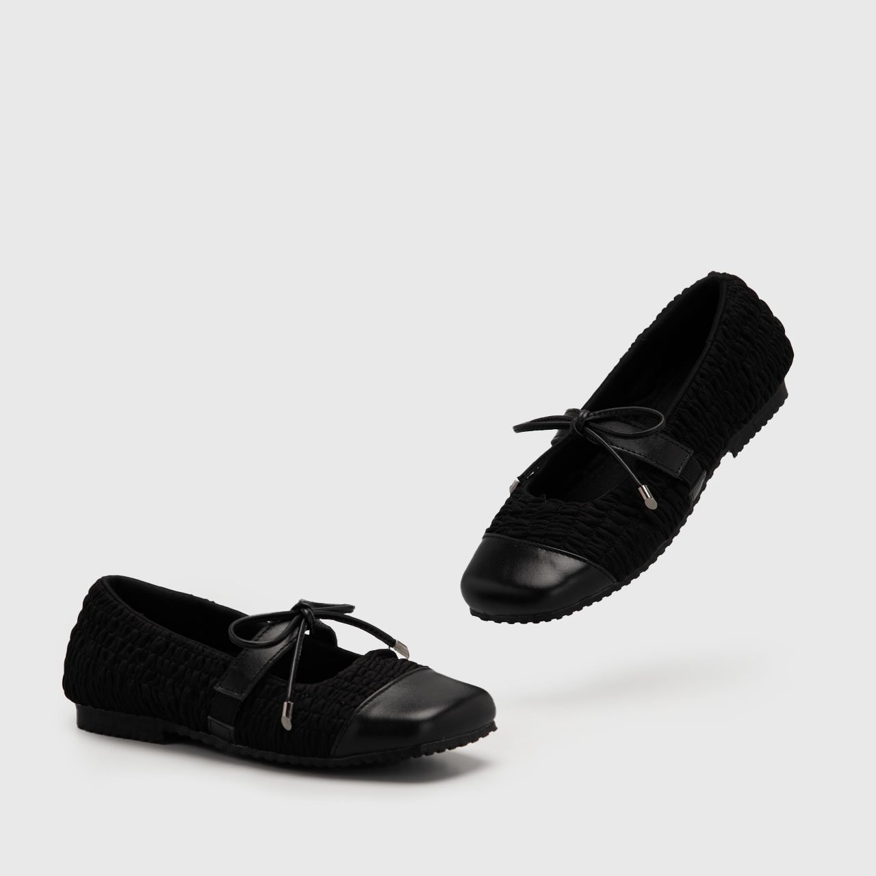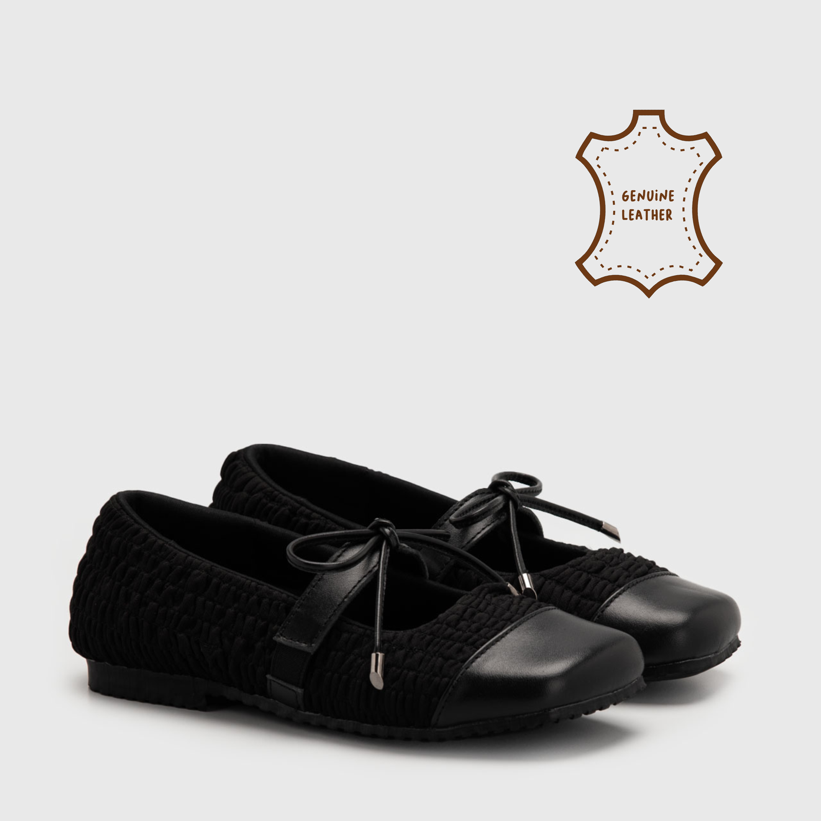 Designed with character and quiet elegance, these square toe flatshoes celebrate texture as a form of expression. The softly wrinkled polyester upper creates a distinctive, tactile surface, while genuine leather accents add structure, polish, and enduring quality.