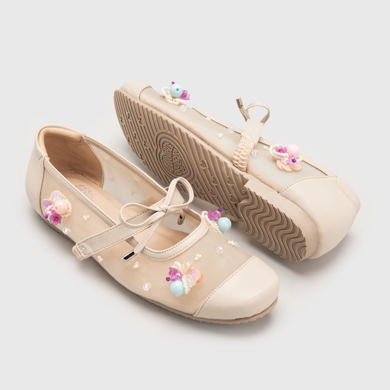 Adorned with carefully placed beads, sequins, and crystal-like accents in soft pastel hues, each pair feels like a miniature garden blooming on your feet. The embellishments are thoughtfully arranged to capture light from every angle—adding dimension, charm, and a hint of whimsical luxury.
