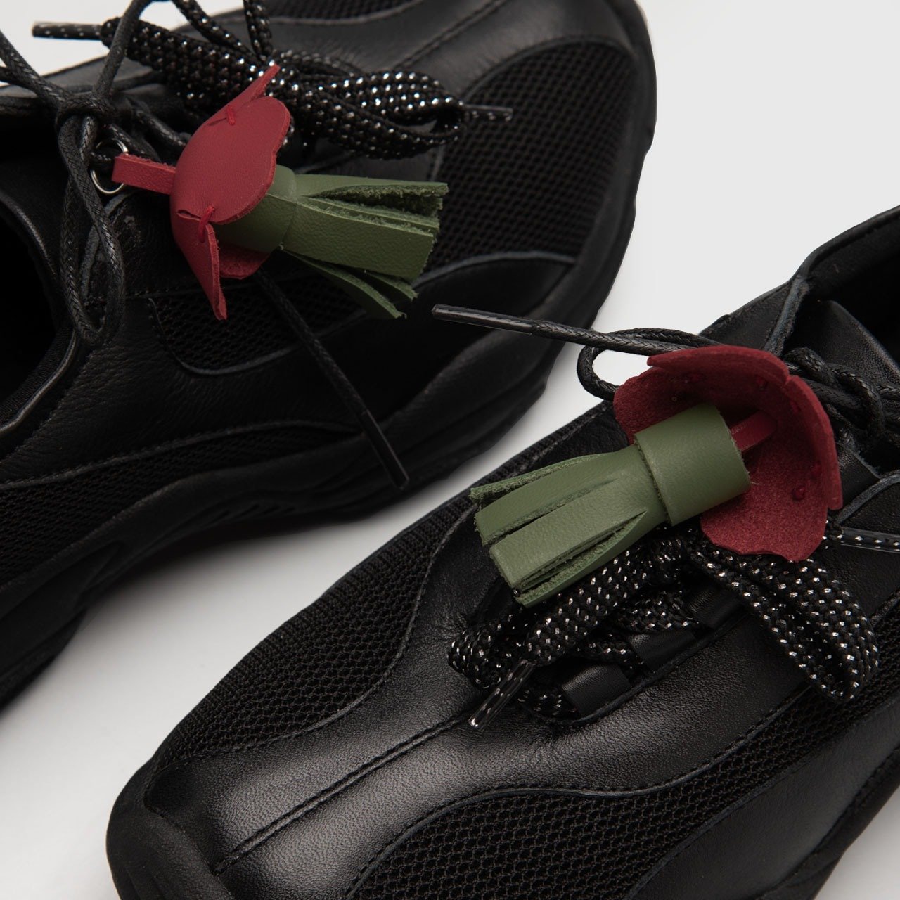 Each piece is carefully cut and assembled, creating a unique accessory to adorn your shoes. Its playful contrast of colors with a simple strap makes it easy to attach, adding a touch of elegance with a hint of whimsy.