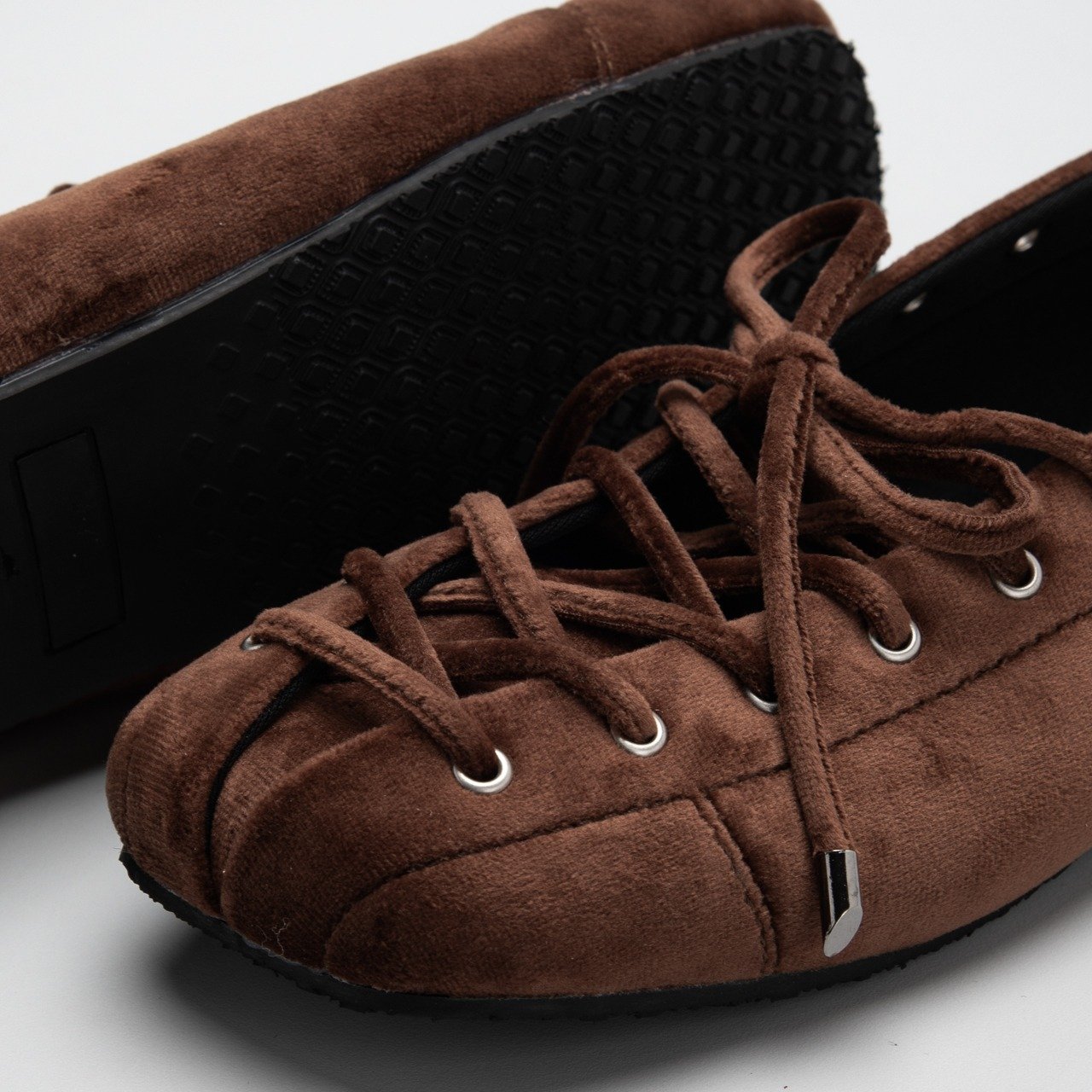 These square-toe flat shoes offer an elegant yet casual touch, making them easy to pair with any outfit. The soft velvet upper delivers a luxurious look with a smooth, subtle sheen. A distinctive detail comes from the lace accent that runs toward the toe, enhanced with metal eyelets for a modern twist.