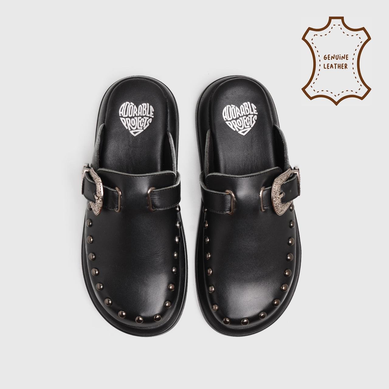 Iranna is a stylish pair of mules sandals featuring a low-height platform, crafted with a lightweight polyurethane outsole and a Genuine leather upper. These mules are adorned with metal embellishments, offering a modern and chic look.
