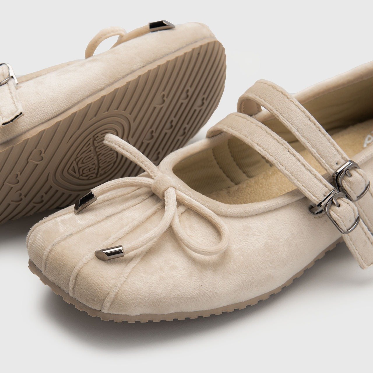 Delicate pleated lines trace the toe for a sculpted, graceful finish, while the twin buckle straps add a touch of sophistication and secure comfort. A tiny bow detail completes the look subtle, sweet, and timelessly chic.