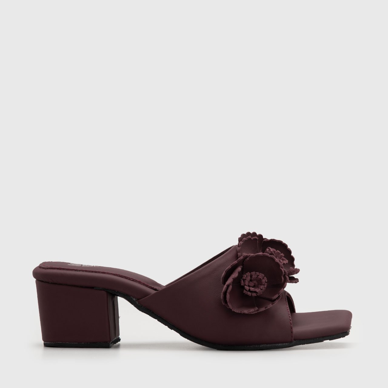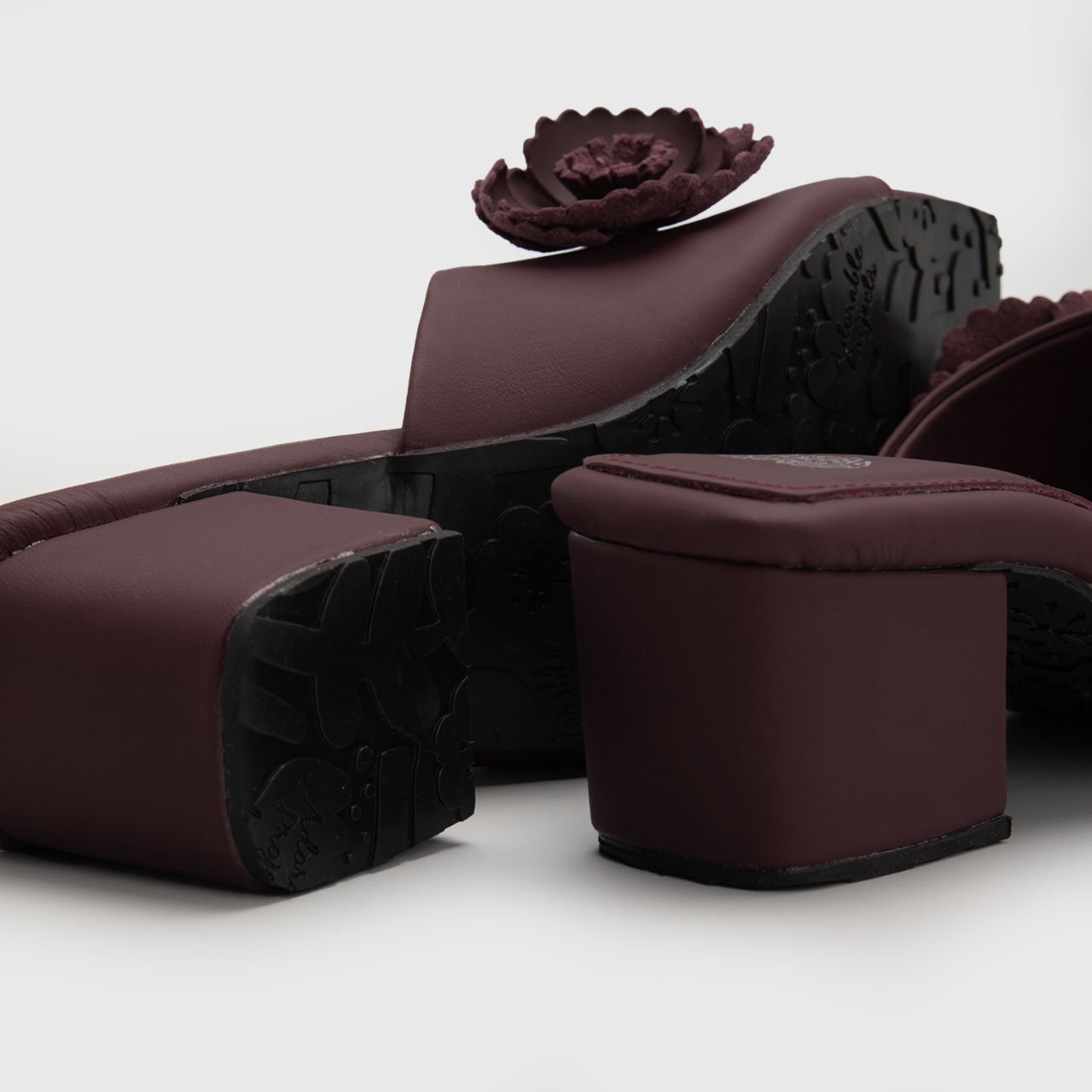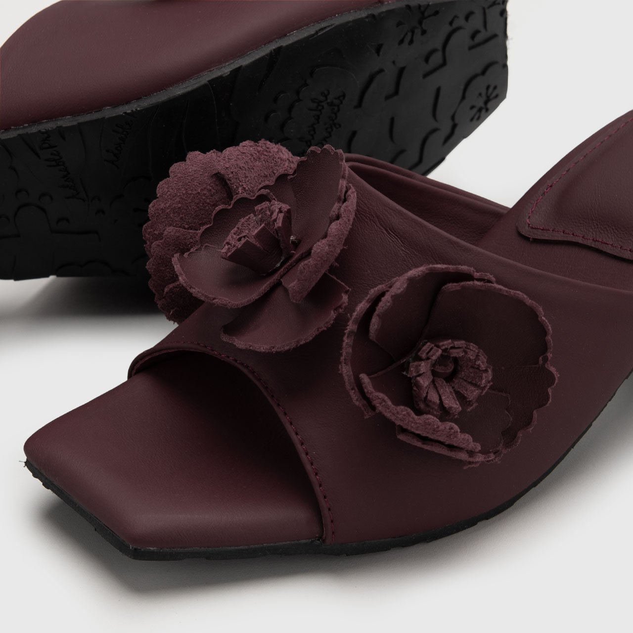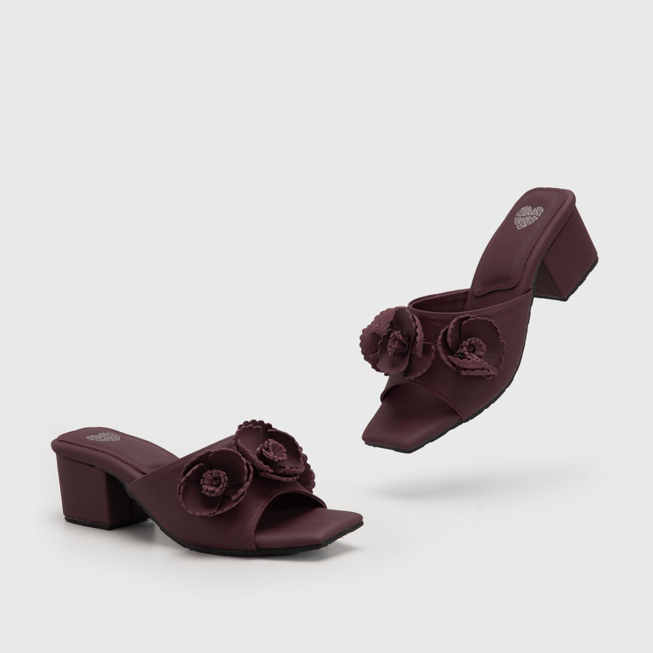 The sculptural floral appliqués bring a statement touch, softly dramatic without overwhelming the design. Each detail is carefully placed to create visual depth, transforming a classic sandal silhouette into a piece of wearable art. The square toe adds a contemporary edge, while the structured block heel provides confident stability for all-day elegance.