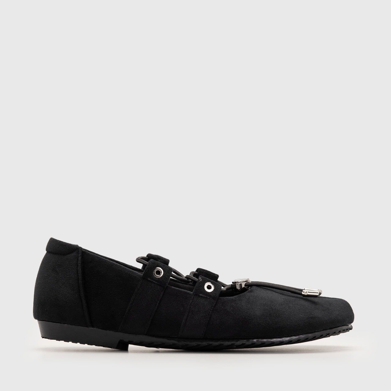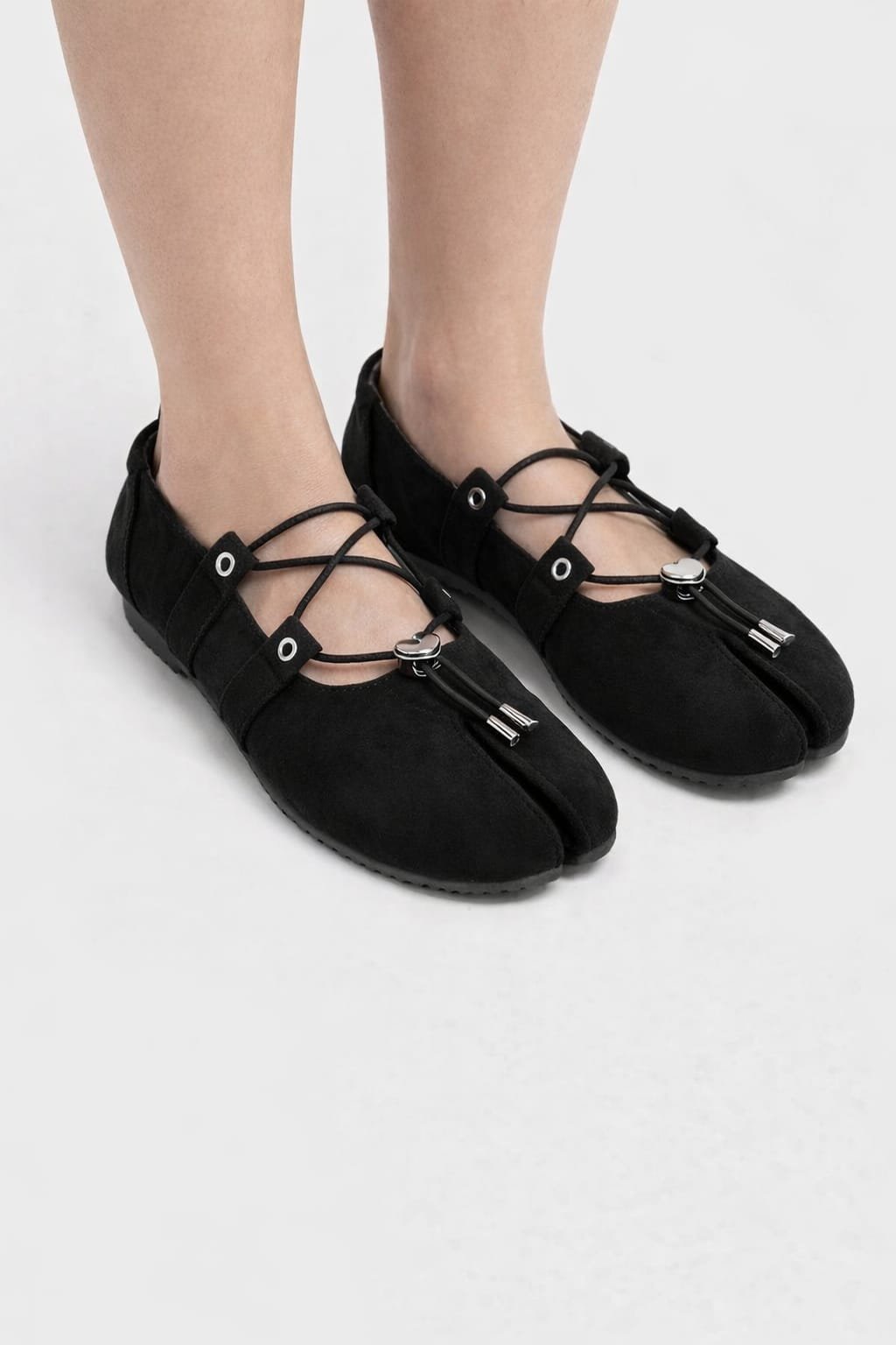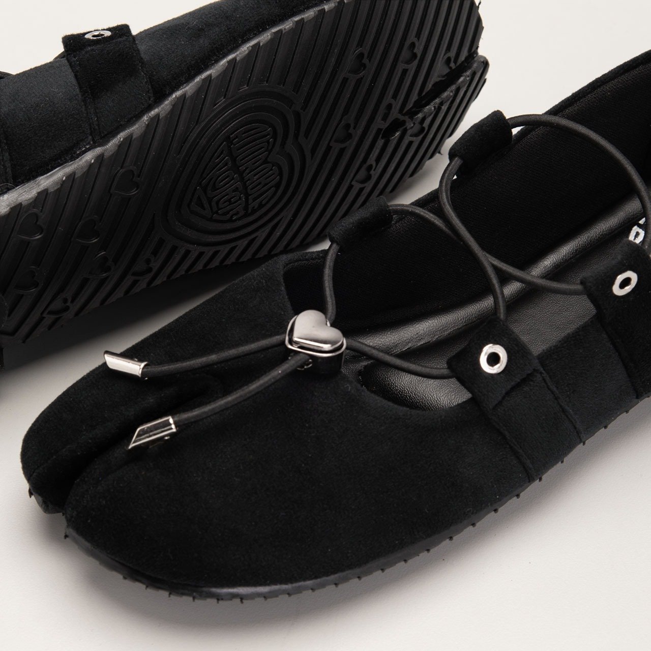 A delicate elastic cord detail, accented with a polished metallic heart charm, brings a refined contrast to the structured form. It adds a touch of femininity while maintaining the clean, modern aesthetic. The low-profile flat sole ensures comfort and stability for all-day wear, making it as practical as it is expressive.