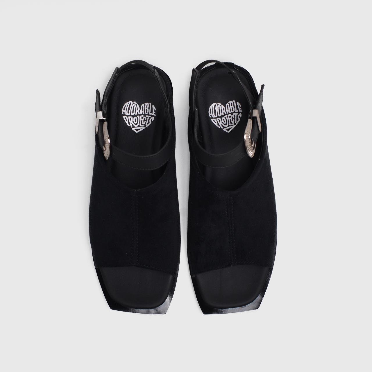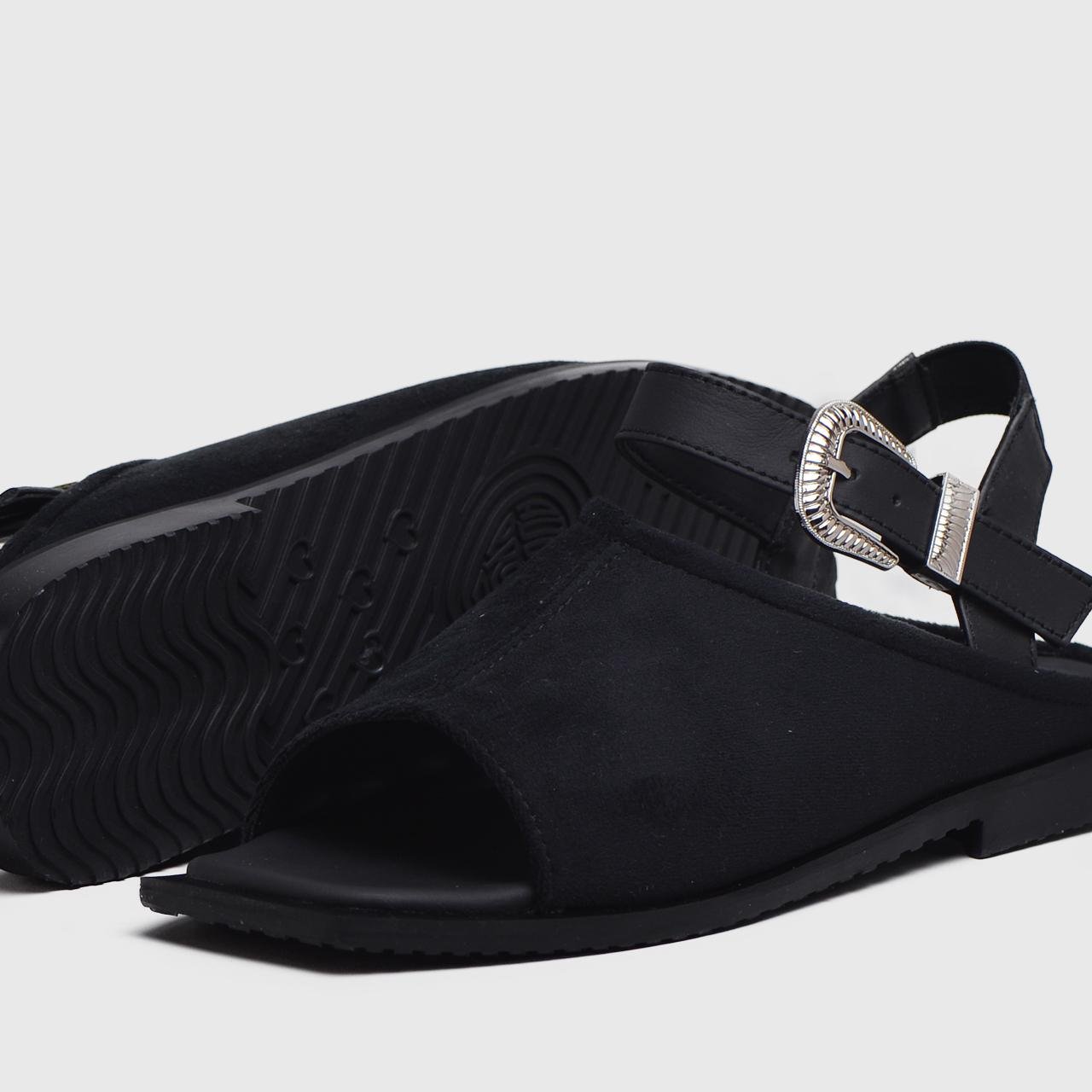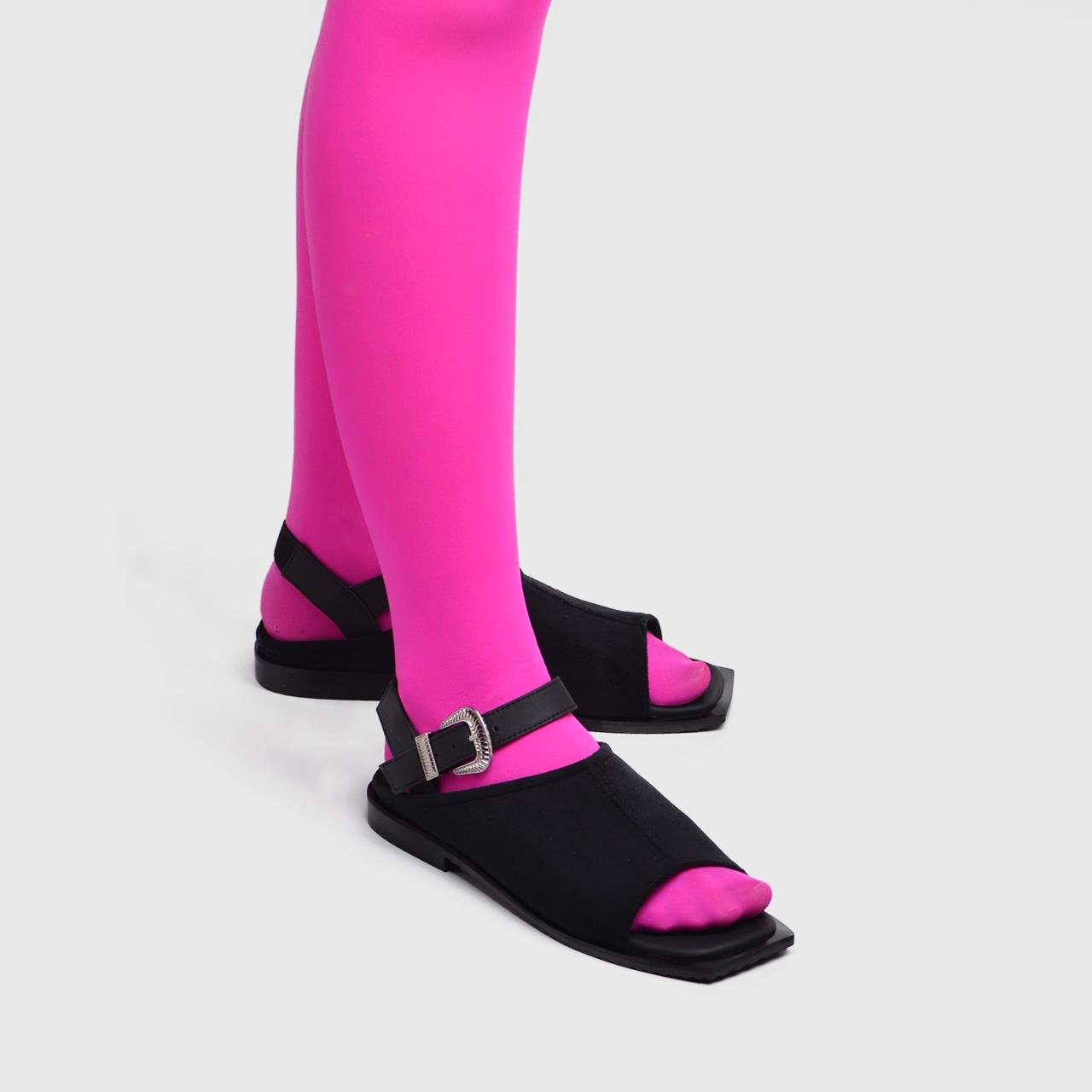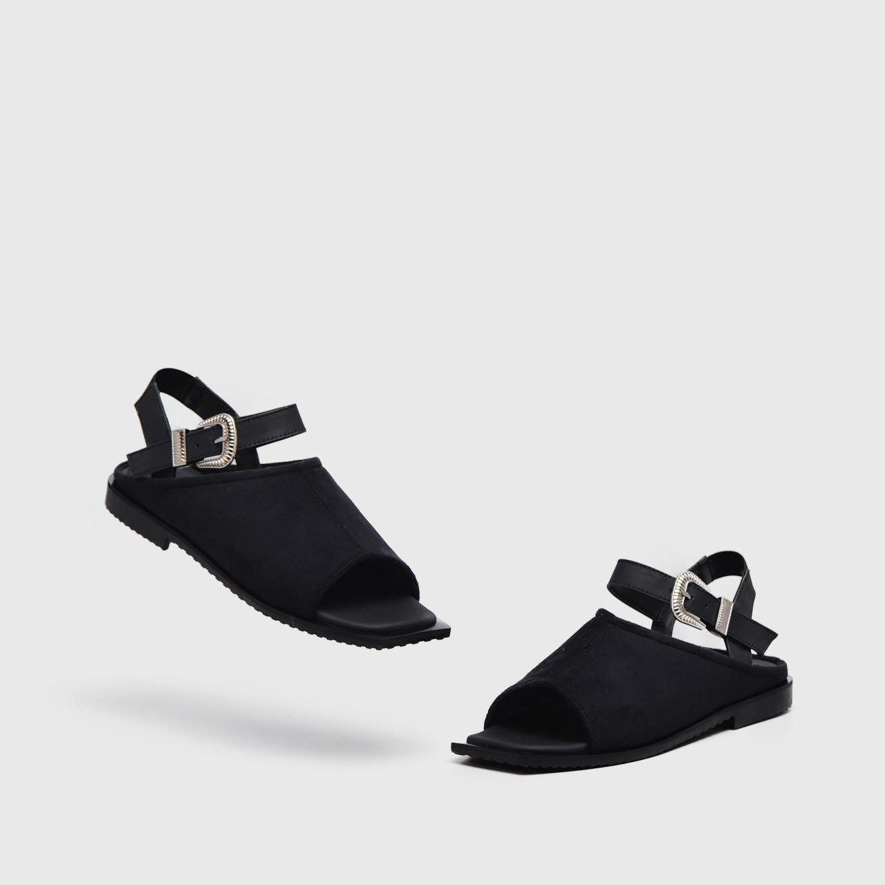Crafted from a blend of smooth vegan leather and soft vegan suede, it features a minimalist silhouette with refined strap placement for a secure, comfortable fit. The adjustable ankle strap adds support, while a sleek metal embellishment on the vamp offers a hint of sophisticated shine.