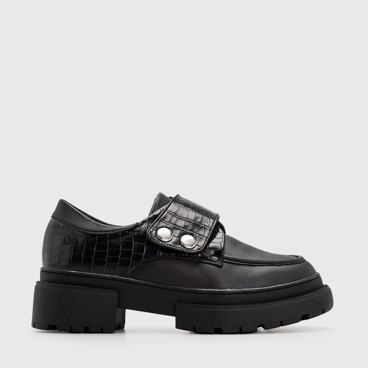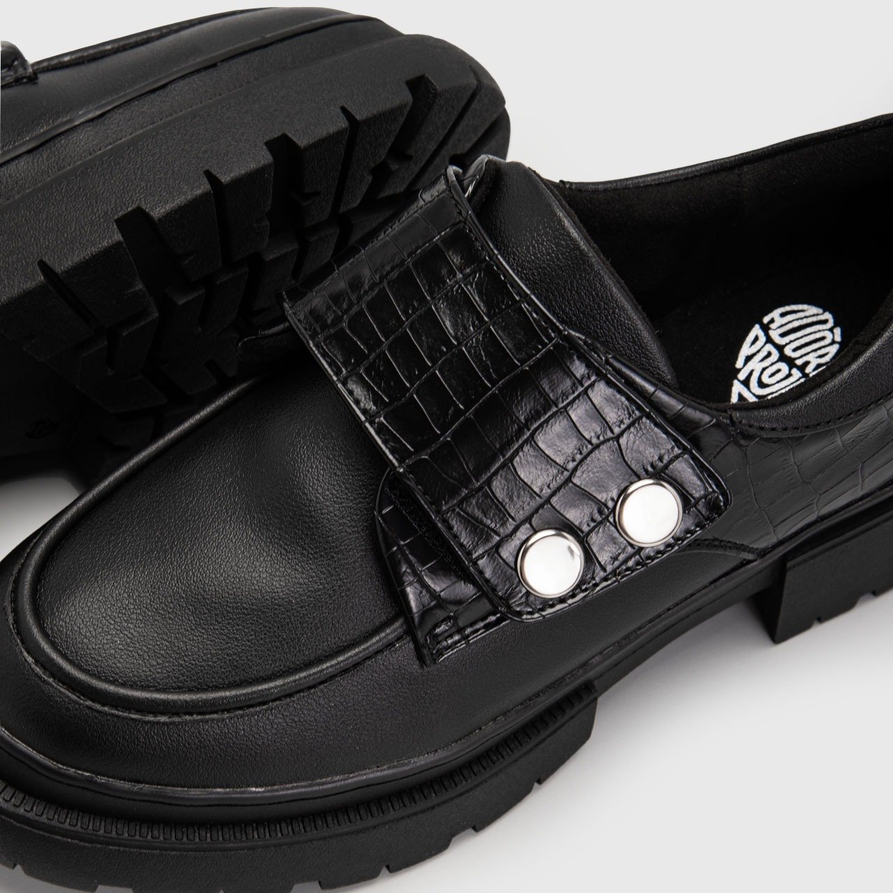 Crafted from high-quality vegan leather, these chunky moc toe shoes bring a modern edge to a timeless silhouette. The smooth upper is paired with textured panel detailing, creating a subtle contrast that elevates its overall character. Finished with statement metal accents, the design feels both refined and unapologetically bold.