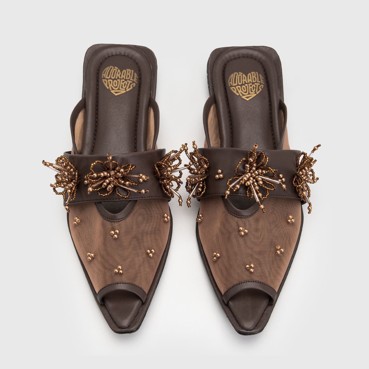 Delicate elegance takes form in these point toe mules, where airy textures meet refined detailing. Crafted with a soft mesh upper, the design feels light and graceful on the foot, creating a barely-there sensation while maintaining a polished silhouette.